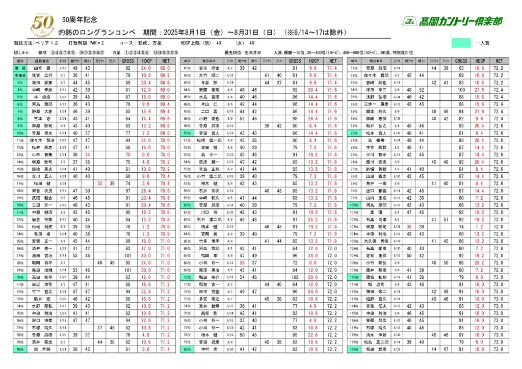 【50周年企画】8月限定 灼熱のロングランコンペ 投稿者: 高岡カントリー倶楽部2025年9月1日2025年9月1日ニュース 成績発表 今年も暑い、暑い夏💦でした☀まさに『灼熱』というのが相応しい猛暑でしたが、当初の予想を超える950名様にご参加頂き、TCC50周年に相応しい盛大なコンペとなりました。 沢山のご参加ありがとうございました!! そして、見事入賞されました皆さま、おめでとうございます!👏✨優勝賞品は旅行券70,000円分!!是非、素敵な旅をたのしんできてください✈ 👑入賞されたお客様には賞品をお渡ししますので、フロントまでお越しください。 クリックすると成績表をご覧になれます https://www.takaoka-cc.co.jp/wp/wp-content/uploads/2025/07/63627287733555324472b7114411ae60.mp4 \50周年特別イベント開催!/🌞8月限定企画🌞🔥灼熱のロングランコンペ🔥期間:R7年8月1日(金)~31日(日)※お盆期間(8/14~17)は対象外参加料:550円成績:新ペリア HD40迄(同NET時=年長者上位)素敵な賞品を多数ご用意🎁✨旅行券・お食事券・スイーツなどなど!✅何度でも参加OK✅8/21開催「ハッピースマイル21」との併用可🎉成績発表は9/1(月)頃、高岡CCホームページにて!▶受付時にフロントにてお申込みください♪水分補給を忘れずに、熱中症に気をつけてご参加ください