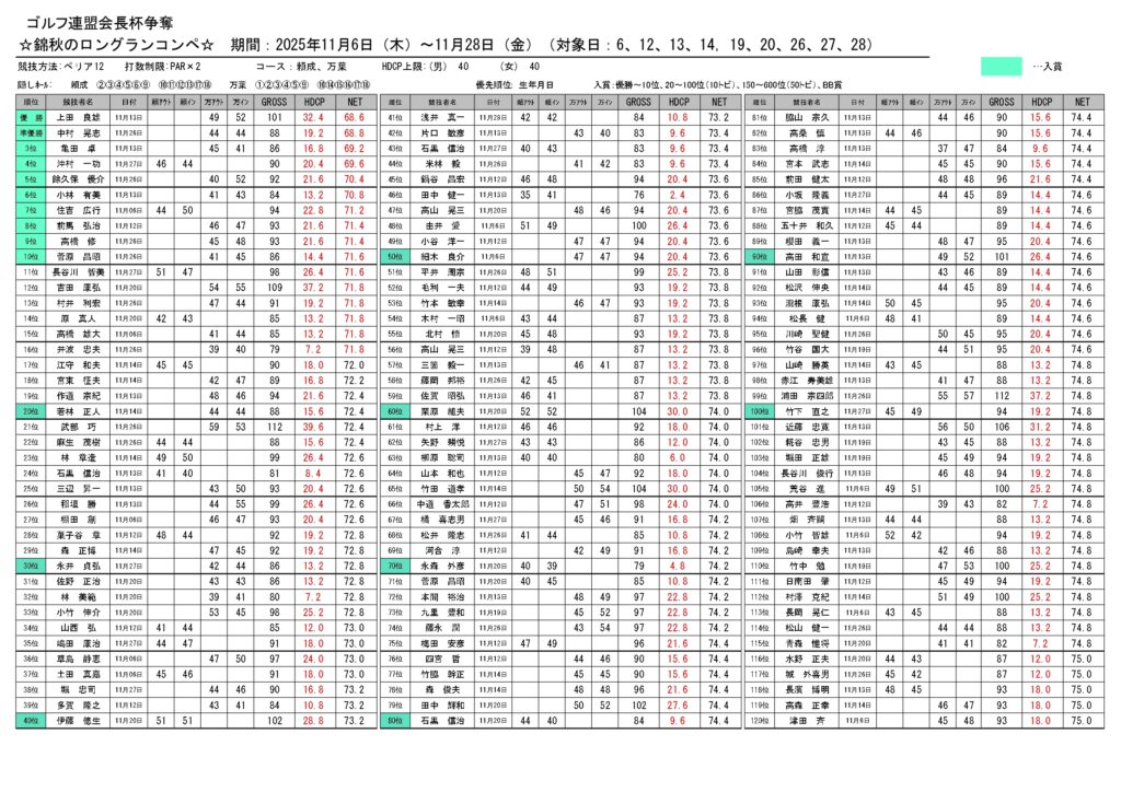 錦秋のロングランコンペ 投稿者: 高岡カントリー倶楽部2025年12月1日2025年12月10日ニュース 成績表 ↑画像をクリックすると成績表がご覧になれます 沢山のご参加ありがとうございました!見事入賞された方には賞品を送らせて頂きます😊 \ゴルフ連盟会長杯争奪🏆/錦秋のロングランコンペ 🍁対象日 <11月>6(木)12(水)、13(木)、14(金)19(水)、20(水)26(水)、27(木)、28(金) 🍁頼成・万葉コース 同時開催🍁参加料550円<食事券1,000円分付🍴>🍁全員新ペリア方式(上限40まで)🍁お一人様何回でもご参加頂けます 🍂参加者募集中!!参加希望の方はプレー当日のフロントにてお申込みください