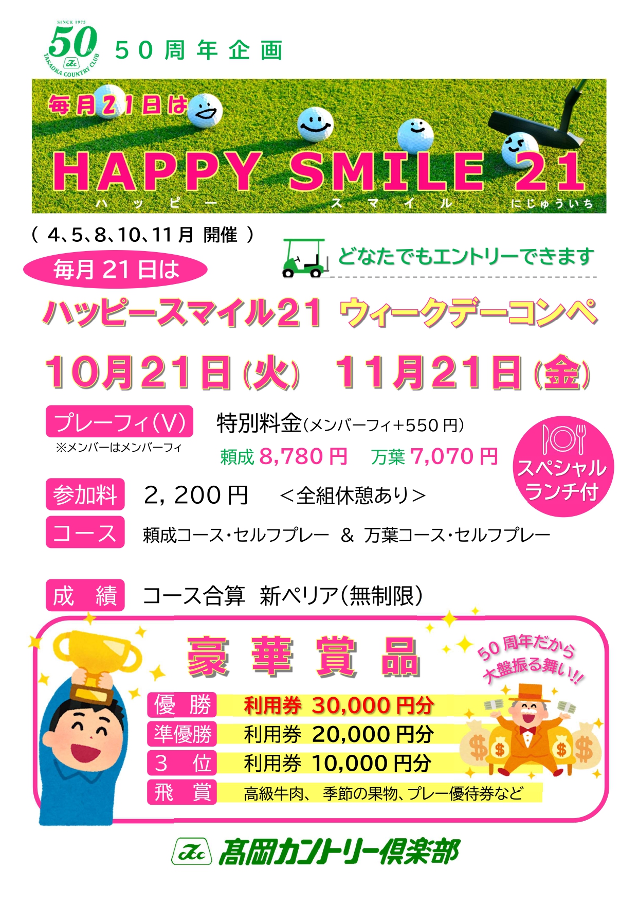 HAPPY SMILE 21 ウィークデーコンペ 投稿者: 高岡カントリー倶楽部2025年10月9日2025年10月9日ニュース 50周年企画========毎月21日は\ハッピースマイル21/\HAPPY SMILE 21😊/========(4、5、8、10、11月開催)HAPPY SMILE 21ウィークデーコンペ10月21日(火)11月21日(金)⛳頼成&万葉プレーフィ/特別価格参加料/2,200円スペシャルランチ付🍴さらに入賞者には豪華賞品!!👑只今参加者募集中🏌🏌️♀️お申込みはお電話か予約フォームにて☎ 0766-36-1111詳細は50周年特設ページをご覧ください