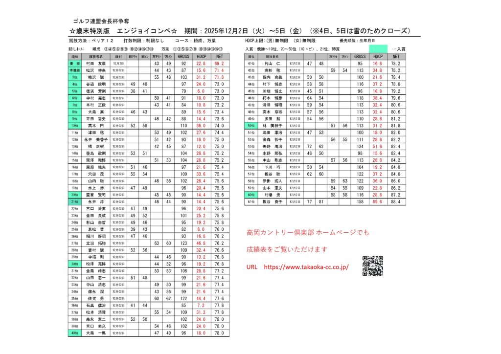 歳末特別版 エンジョイコンペ 投稿者: 高岡カントリー倶楽部2025年12月5日2025年12月10日ニュース 成績表 ↑画像をクリックすると成績表がご覧になれます 沢山のご参加ありがとうございました!見事入賞された方には賞品を送らせて頂きます😊 競技概要 歳末特別版 エンジョイコンペ FINAL50周年 冬の企画は4日間のロングランコンペ開催日▶12月2日(火)、3日(水)、4日(木)、5日(金)※先着107名様💰参加料550円参加賞あり🥰とってもお得な特別価格!しかも成績は新ペリア(HD上限なし)だから全員に入賞のチャンスあり★2025年のゴルフ納めいたしましょう♪🏌拡大してご覧頂けます。⇒ 拡大