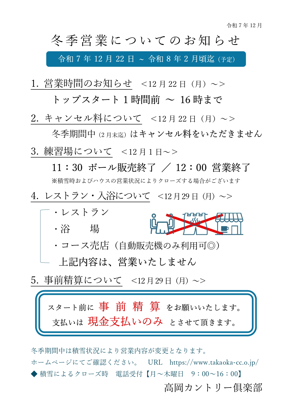 冬季営業についてのお知らせ