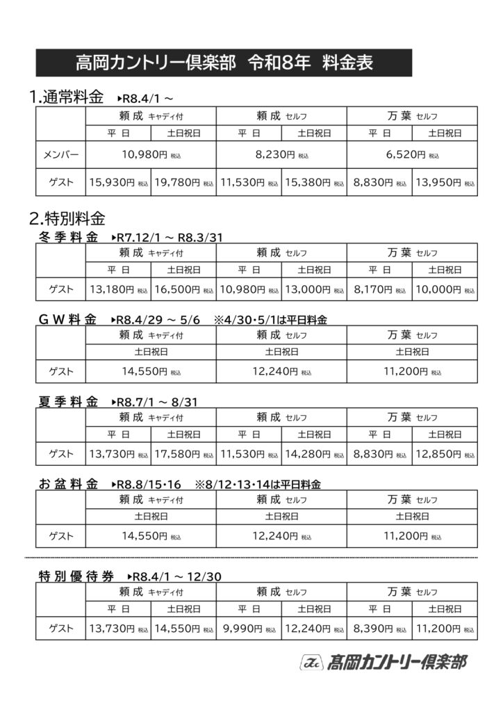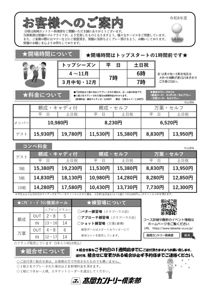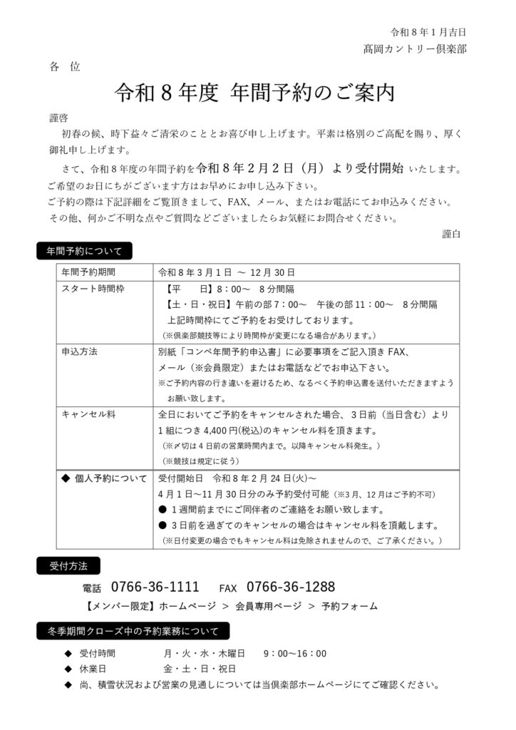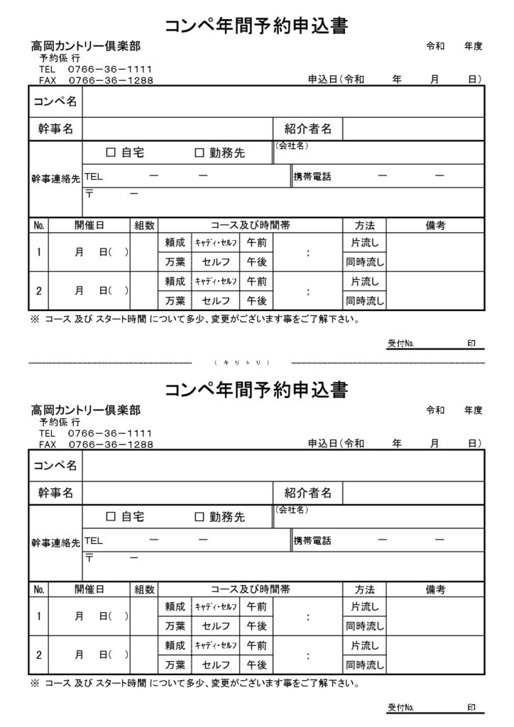 のいずれかより高岡カントリー倶楽部 予約係までお送りください。