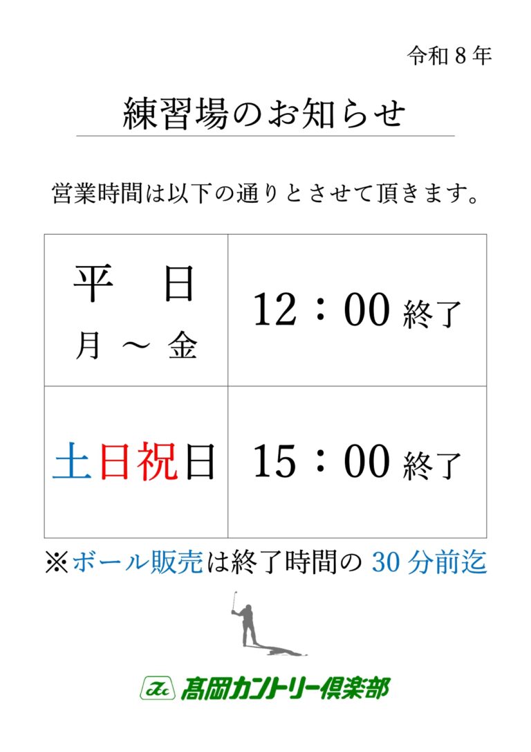 練習場 料金改定のお知らせ 練習場 ご利用時間についてのお知らせ 練習施設について ゴルフ場と隣接した練習場を完備。バンカー練習も行えますのでぜひご利用ください。 打ちっぱなし練習場(2階打席)<250y> ドライバー可◎打ちっぱなし練習場(1階打席)バンカー練習場頼成練習グリーン万葉練習グリーン ◎練習コイン 1枚 30球 メンバー 220円(税込) ゲスト 330円(税込) ※6/1~ ゲスト 440円(税込) クラブハウス内 フロントにてお買い求め下さい ◎練習場利用時間(通常時) 平日 プレースタート時刻の1時間前 ▶ 13時00分 土日 プレースタート時刻の1時間前 ▶ 16時00分 ※時期により最終利用時間を早める場合もございます。 ◎ボール販売時間 最終時間の30分前まで ◎練習場利用時間(冬季) プレースタート時刻の1時間前より ▶ 10:30終了 ※天候等により、コースをクローズした場合は練習場もクローズ致します。 ◎パター練習場 15時45分まで ※練習施設は状況により最終利用時間を早める場合もございますので、ご了承ください。