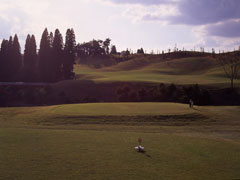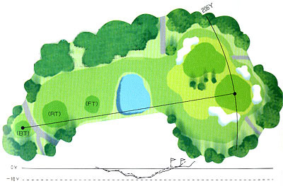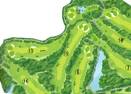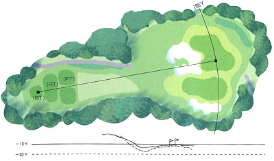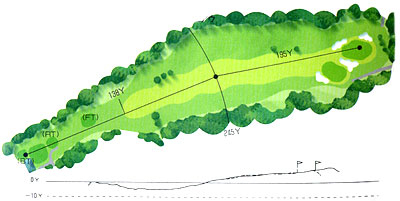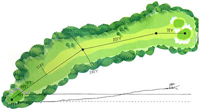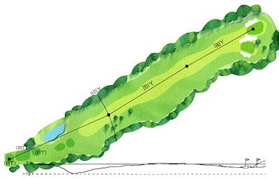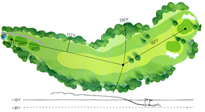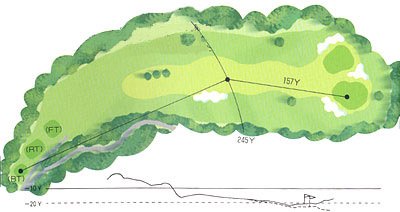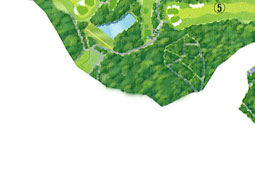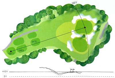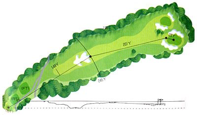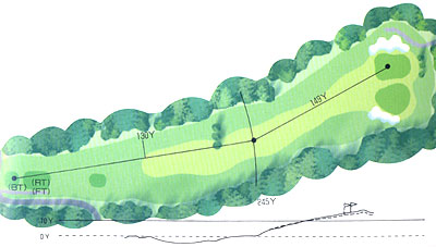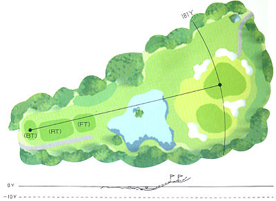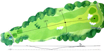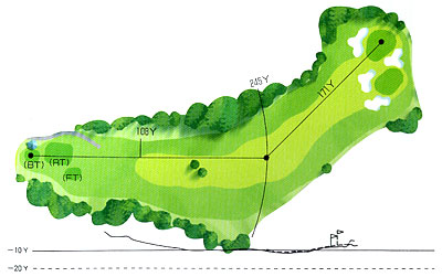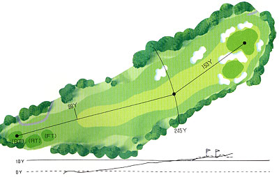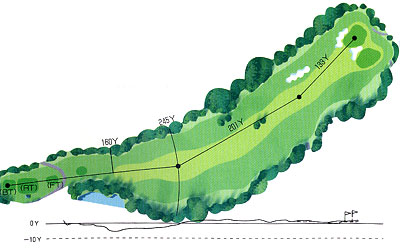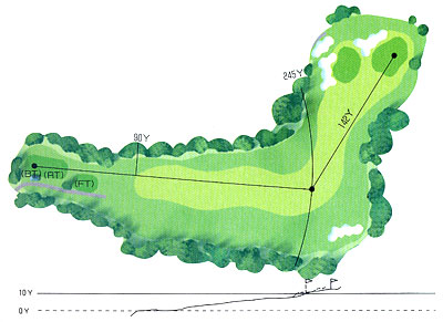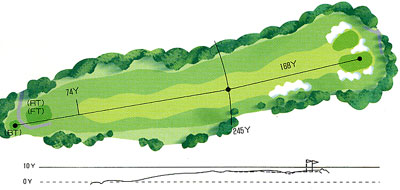 前方の3本松の右目がよい。飛距離のある人は右山裾が狙い目。第2打地点から緩い登り。第3打目はグリーン両側にガードバンカーがあり注意。グリーンは受けグリーンで複雑なアンジュレーションあり。左側から攻めるとよい。 |