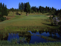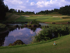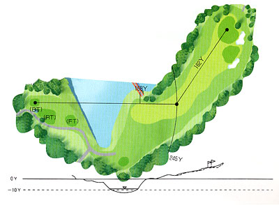 池幅70ヤードの池越えのミドルホール(左に35度ドッグレッグ)