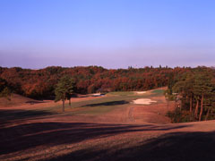 フェアウェイ中央にチューリップ形の大きい浅いクロスバンカーがある。第2打目は両グリーン中央の松林を目標に。